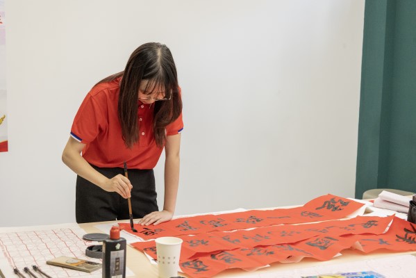 活动最后,2019级本科生伍钰婷同学笔力遒劲书写下“电气学院师生祝福伟大祖国繁荣昌盛,祝福学校弦歌一路高声唱,一片其乐融融的氛围中,现场师生也纷纷拿起纸笔,书写对祖国、母校的热爱与祝福。