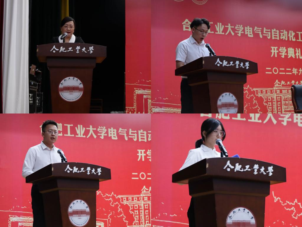 教师代表孔慧芳教授鼓励新生学会变换、做好规划,要确立目标,培养坚定的理想信念,有强烈的责任感,有爱国报国的大情怀。要注重学业,养成良好的自学能力,通过学习改变自己,改变自己的社会地位,改变自己看世界的方式,改变自己的心性。要多维思考,不断拓展创新能力,面对问题和困难,保持乐观,不断创新,努力迈上广阔无垠的人生舞台,登上风光无限的巍峨山峰。高年级本科生代表董磊勉励同学们充满热情,不忘初心,做一个积极向上的电气人;勤学苦练,增长才干,做一个有真正本领的电气人;胸怀抱负,脚踏实地,做一个有责任担当的电气人。心怀“请党放心,强国有我”的铮铮誓言,秉承“清澈的爱、只为中国”的深情厚意,在工业报国的征途上接力奔跑!研究生新生代表许乾倡导全体新生以梦为马,不负韶华,勤学苦练,增长才干,胸怀抱负,脚踏实地,做有理想、有本领、有担当的电气新人。本科新生代表齐珺祎呼吁同学们珍惜大学四年时光,不虚此行、一心向阳、奔驰激越,奔赴丰富多彩的大学生活,在文化知识、社团活动、社会实践、科技创新中不断提升自我,怀揣梦想,满载期许,开启崭新的人生篇章。