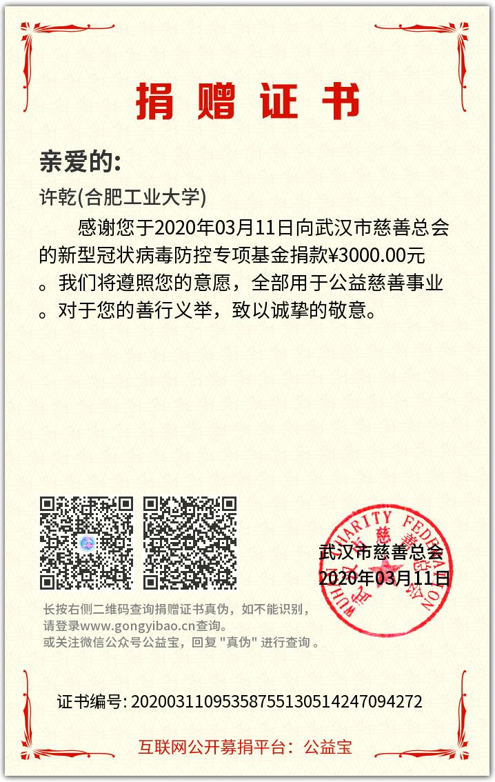 当看到武汉慈善总会寄来的捐款证书上印着的“许乾(91免费