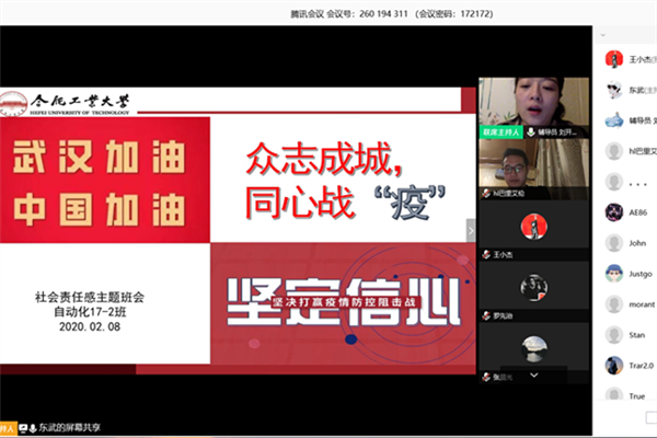 为深入贯彻落实教育部、安徽省疫情防治工作要求,落实学校新型冠状病毒感染肺炎疫情防治学生工作视频推进会会议精神,将疫情期间的学生工作落细落实,2月8日—2月9日,电气学院各年级辅导员分别组织召开抗击疫情线上网络主题班会。