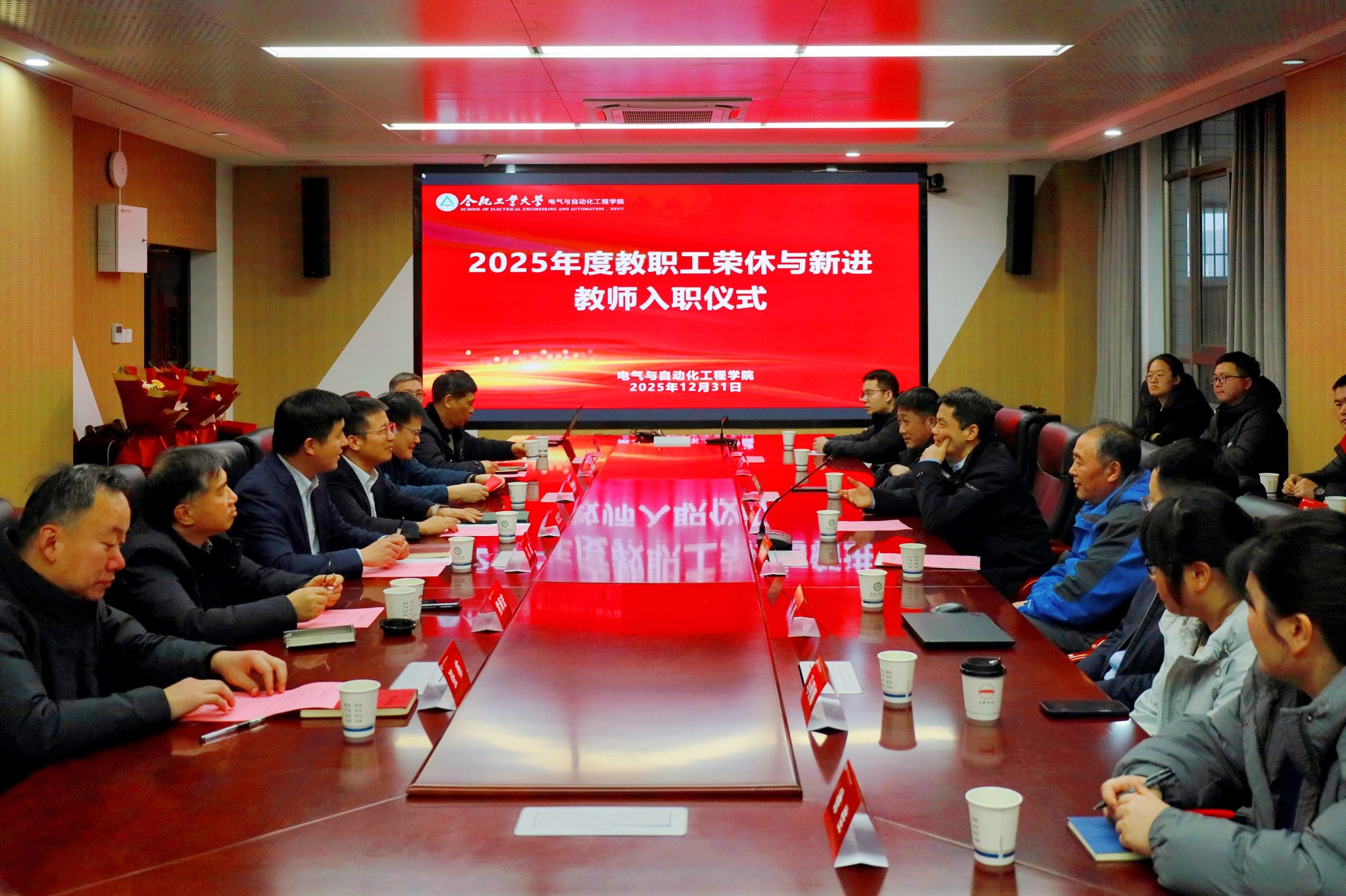 在逸夫楼1009会议室举行2025年度教职工荣休暨新教职工入职仪式。学院领导班子、各系(中心)负责人、2025年退休职工及新入职青年教师出席活动。
