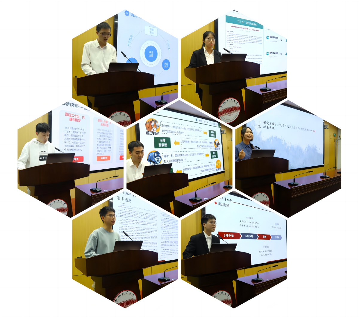 分享环节,吴泽城、鲍诚、程乐、崔振渠、徐正扬、王芷琦、惠昕7位拥有丰富暑期“三下乡”社会实践经验的同学作为主讲嘉宾,依次向同学们分享了他们所带领的团队在暑期社会实践中的精彩过程和做出的优秀成果。7位主讲嘉宾主要从项目探索,实践落地,成果凝练三个方面展开分享,向大家介绍了如何寻找合适的人选来进行队伍组建,如何确定团队社会实践的主题,如何合理分工协作推动项目实践落地,如何有条不紊地开展成果凝练工作,以及如何多渠道地进行作品报送。