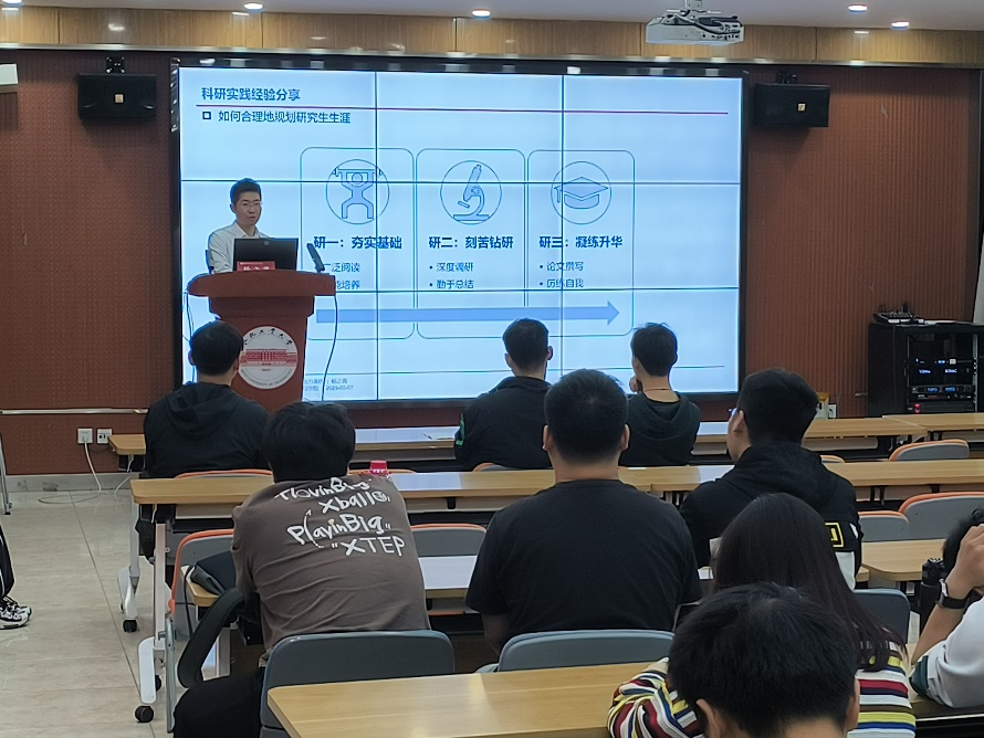 杨之青主要围绕求学历程、项目管理和时间分配这三个关键词展开介绍。他从自身本科阶段到博士阶段的求学经历引入话题,讲述了在德国七年间求学的故事,鼓励同学们要志存高远,培育勤奋学习的精神,养成爱读书的学习习惯。杨之青特别强调了沟通的重要性,指出做研究期间要积极主动地与老师同学保持沟通,彼此互帮促学。最后,杨之青以读研阶段如何管理好时间分配,如何平衡好生活与科研等话题,建议同学们在研一期间多读文献,研二期间接手项目将理论与实践相结合,研三期间总结经验撰写毕业论文,无论遇到多大的困难和挫折,都要勇往直前。在交流环节,杨之青对同学们所提出的问题做了认真细致的回答。针对科研学术中遇到的困难和疑惑,他鼓励同学们要正视困难和压力,不轻易言败,端正科研态度,着力瞄准问题,主动创新路径,终会突破重围、收获硕果。