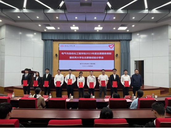分享交流环节,十佳大学生志愿者代表分主题开展志愿服务经验分享,李子昊以《爱出者爱反,福往者福来》为题介绍自己的志愿服务和心得感悟,重点向同学们分享了无偿献血的先进事迹,激励青年学子在服务奉献中实现自身价值。信冉通过初相识、向阳生、系老情、展蓝图四个部分介绍自己从坚守初心到茁壮成长再到使命传承的志愿经历。张帆重点介绍了自己在儿童帮扶、校园宣传、志愿服务等方面的事迹,从个人素养提升、培养社会责任感等方面介绍了志愿服务的价值意义。丁浩航从社区治理、文明实践等方面展示了自己的志愿服务经历,鼓励同学们投身志愿服务,贡献青春力量。电气20-6班王子康、电气20-5班王翔宇代表志愿服务先进班级做经验分享,介绍了班级开展志愿服务的整体情况、特色活动和突出典型,介绍了“党建引领团建,团建带动班建”总体格局,党团员带头服务,营造了人人参与志愿,人人乐于服务的良好氛围。受表彰的先进班级和个人有的利用寒暑假奋战在疫情防控、抗洪救灾一线,有的投身敬老助老服务,助力社区文明建设,有的热心教育事业,关爱困境儿童,陪伴成长成才,有的积极宣传环保理念,以实际行动守护美好家园,志愿者的优秀事迹感动了现场每一名观众,热烈的掌声在会场此起彼伏。