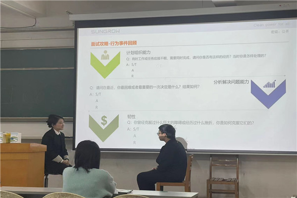 校企合作单位——阳光电源股份有限公司和双杰电气股份有限公司人力资源经理李晓燕女士和邵珠恒先生为同学们做简历制作技巧分享和求职面试经验分享。“如何作答一份清晰的职业规划”“如何撰写一份优秀简历”“如何在面试中脱颖而出”,两位老师由同学们非常关心的三个问题出发,由浅及深地展开了方法与技巧讲解。