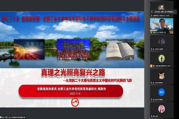 开展专题党课学习。安徽省政协委员、学校党校原常务副校长姚跃传以“真理之光照亮复兴之路——从党的二十大看实现马克思主义中国化时代化新的飞跃”为题,通过线上的方式讲授党课,学院党校班主任以及发展对象班和积极分子班全体学员参与学习。