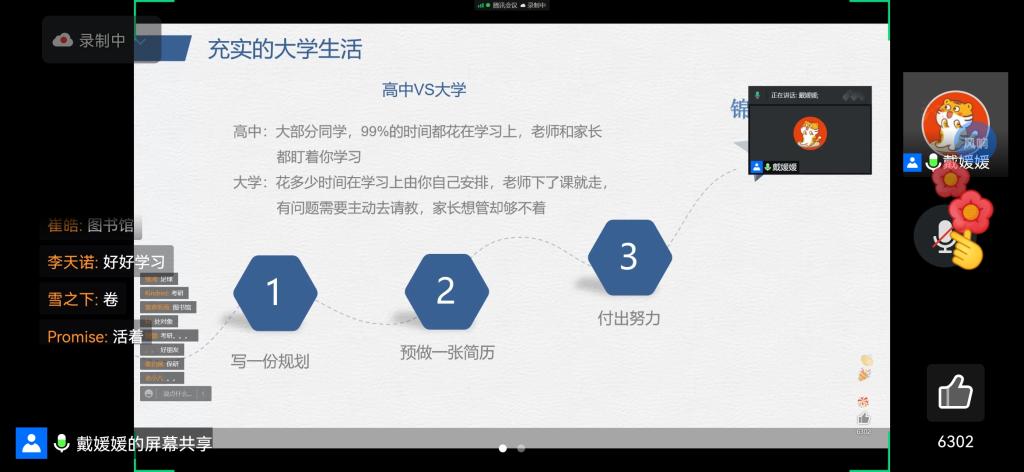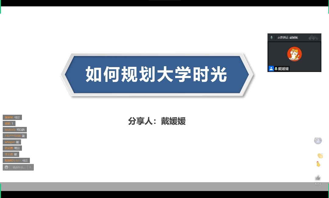 戴媛媛首先鼓励同学们做一张自我规划表,畅想大学生活,树立规划目标,坚定奋斗初心,她通过阐述高中与大学生活的区别强调锦绣的前程需要通过有效的规划和持续的努力实现,并通过自身经历勉励同学们在专注学业的过程中发展兴趣爱好,保持尝试新事物的热忱,保持激情,乐观向上。在专业发展方面,她从就业、升学、出国三个方面介绍专业前景与道路选择,鼓励同学们提前做好目标规划,确定发展方向,不断充实自己,不断进步,向着未来的目标大步跨进。最后她结合自己的本科经历呼吁同学们在大学里做该做的事情,鼓励同学们学好专业课,通过英语四六级和计算机二级考试,坚持体育锻炼,做到“每天运动一小时,为祖国健康工作五十年”,积极参加含金量高的竞赛,激发自己的潜能,珍惜并利用好大学图书馆资源,广泛阅读开阔眼界,积极通过学生会、团委等学生组织及社团活动、社会实践锻炼提升自己,在大学的学习和生活中找到自己的价值,为自己的人生负责。