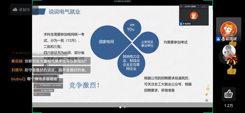 电气学院2019届本科毕业生、清华大学硕士毕业生戴媛媛为学生开展学业规划培训,讲述她的本科求学经历和学习理念,她从自身经历、道路选择和大学里要做的事三个方面向同学们讲解如何规划大学时光。