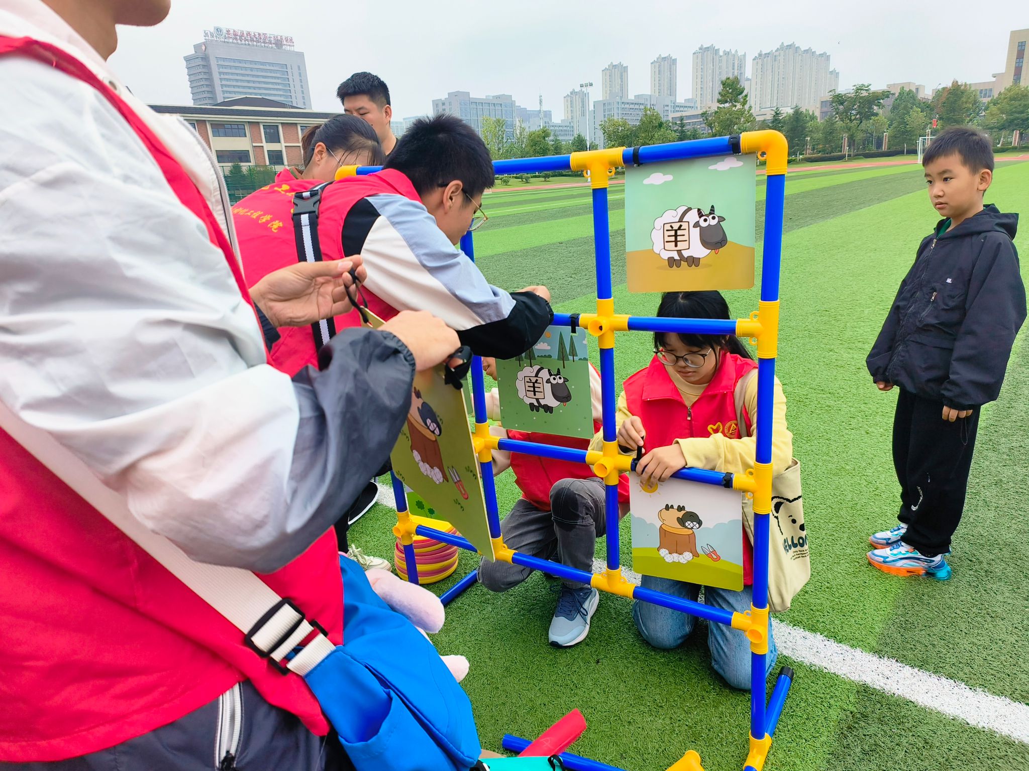 正式比赛分为健康知识答题、亲子障碍赛赛跑、两人三足、篮球保龄球和九宫格飞盘五个项目。健康知识问答环节每组家庭的小朋友向面前的海绵垫扔沙包,通过海绵垫背后字母抽取题目,题目由家长作答,志愿者负责打分并进行排名。亲子障碍赛环节小朋友和“大朋友”组队从起跑线出发,跨过由充气道具组成的障碍回到起点,志愿者在一旁计时,根据所用时间给出排名并确定每组得分。“两人三足”环节家长和小朋友将两条腿绑在一起,从起点跑到终点,用时最短获胜。篮球保龄球环节,志愿者将矿泉水瓶按顺序排列,小朋友和家长分别站在线后用篮球打倒矿泉水瓶,志愿者记录累计打倒瓶数,打倒数越多排名越高。九宫格飞盘环节小朋友和家长站在线内,分别投掷三次飞盘,扔出飞盘击中九宫格上的数字,即可加上该数字对应的得分,每个家庭按照投掷得分总和计算成绩。小朋友和家长们斗志昂扬、力争上游,比赛现场热闹非凡,在志愿者和工作人员的努力下活动圆满结束,工作人员为获胜的家庭发放奖品。