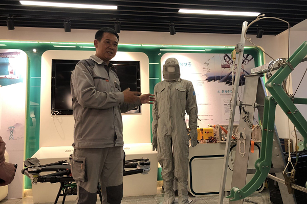 大电网安全可靠运行尤为重要,带电作业是保证电网安全稳定运行的有效法宝。当天上午,超特高压带电作业班班长吴维国,全国”工人先锋号”的唯一代表,为团队师生介绍了一代又一代皖送人的一路艰苦卓绝的奋斗历程:班组人员在离地近百米之处与电共舞,克服巨大的心理恐慌,全身带上100万伏电压工作,一旦失误,人体就会瞬间灰飞烟灭,操作时全身有针刺感和蛛网感,可谓是“勇闯生命禁区”。团队师生还了解到,吴维国劳模创新工作室一直致力于开展技术攻关,填补多项世界级领域技术空白,在国网系统内率先具备全电压等级带电作业能力,为安徽大电网安全运行提供重要技术保障。