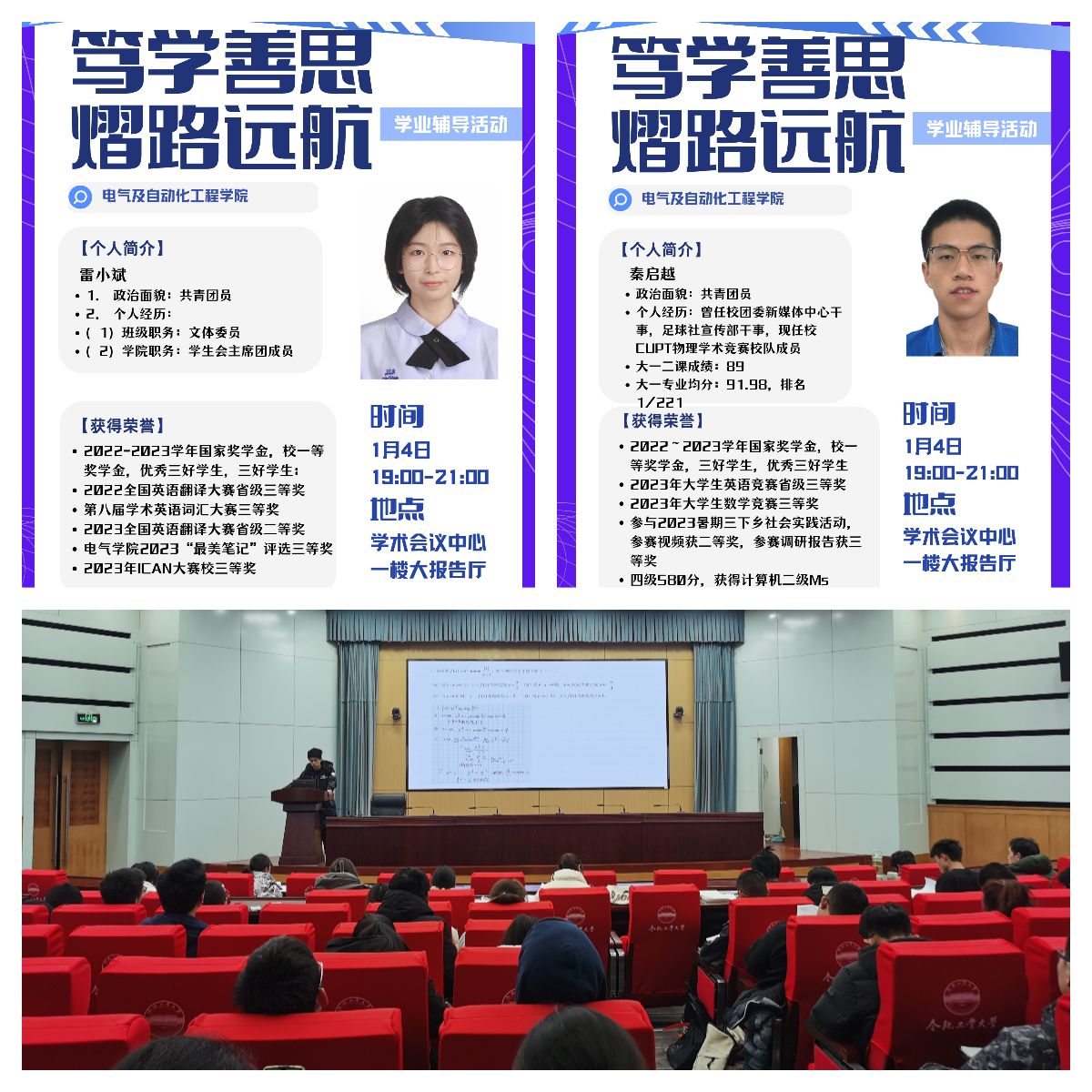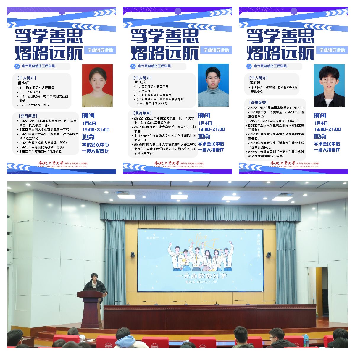 开展“‘熠’路远航,笃学善思”学业辅导系列活动,活动分为“骨干教师引航,明晰专业方向”“朋辈榜样助航,分析重点难点”“学习互助导航,增强发展动能”三部分内容,打造“骨干教师-朋辈榜样-学生互助”三位一体的学业帮扶体系,帮助学生明晰发展方向,掌握学习方法,增添学习动能,助力成长成才,学院750余名学生参加活动。