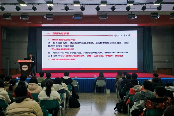 2024年“挑战杯”大学生创业计划竞赛校内选拔动员暨“青·成长”创新创业赛事精解会在屯溪路校区东风报告厅举行。校团委创新发展部部长陈曾珍、校十佳大学生科技创新标兵苟艺辉受邀主讲,学院团委相关负责人和150余名学生参会。