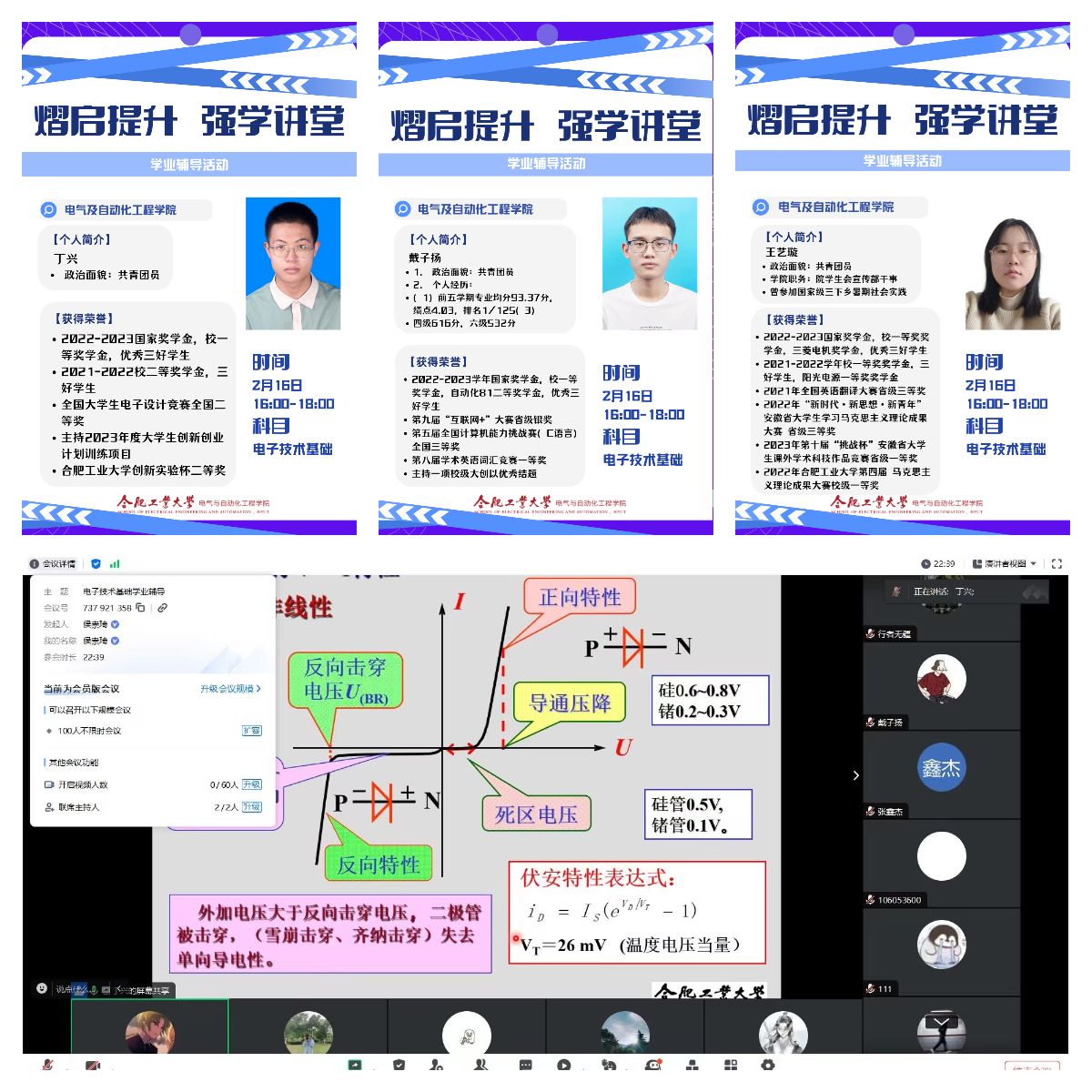 开展“‘熠’启提升,强学讲堂”线上学业辅导活动,学院建立“骨干教师+朋辈讲师”学业导师队伍,各年级调研摸排学生需求,针对《电力电子技术》,《电子技术基础》,《线性代数》,《工程图学》等课程开展学业辅导,帮助学生掌握学习方法,把握重点难点,增添学习动能,树立学业信心,顺利通过考试,学院150余名学生参加活动。
