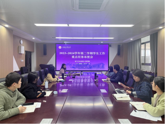 在逸夫楼1009会议室开展2023-2024学年第二学期学生工作重点任务布置会,学院相关负责人和全体辅导员参加会议。