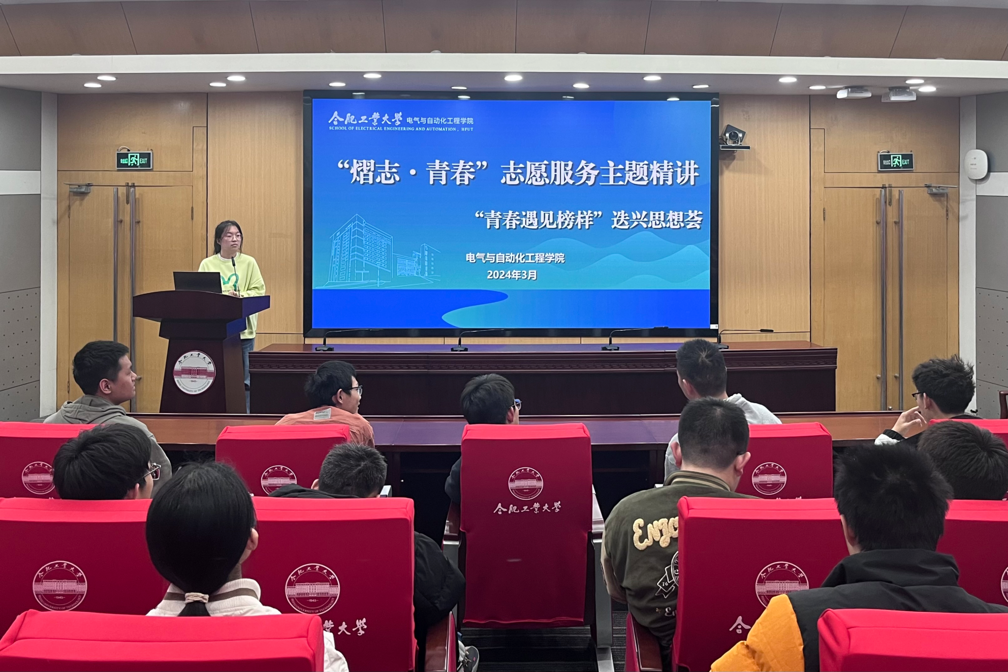 于屯溪路校区学术会议中心二楼报告厅开展“青春遇见榜样”迭兴思享荟之“熠志·青春”志愿服务主题精讲,阳光志愿服务中心负责人赵静怡受邀主讲。