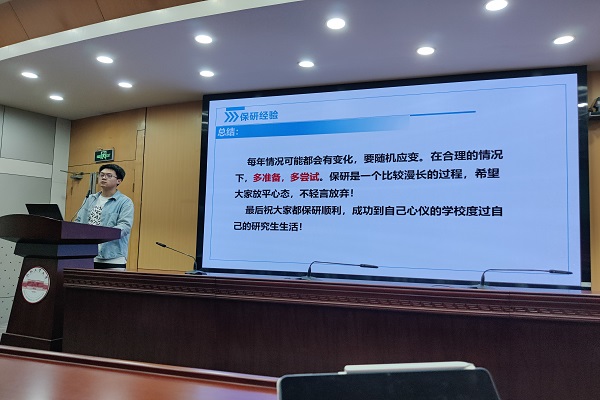 活动在轻松而热烈的氛围中展开。推免至西安交通大学的田一麟以“四载青春,一‘研’为定”为题分享了宝贵经验。他认为,保研之路并非坦途,要以明确目标和坚定信念为支撑,以扎实基础和提升能力为基石,以关注动态和充分准备为驱动,以积极交流和资源整合为助力,他鼓励大家迎难而上,直面挑战。推免至湖南大学的谭恒元重点强调了选对研究方向的重要性,建议同学们要综合考量个人兴趣、学术背景、市场需求等因素,科学分析学科设置,逐步明确研究方向,选定契合心仪导师,奠定坚实学术基础。