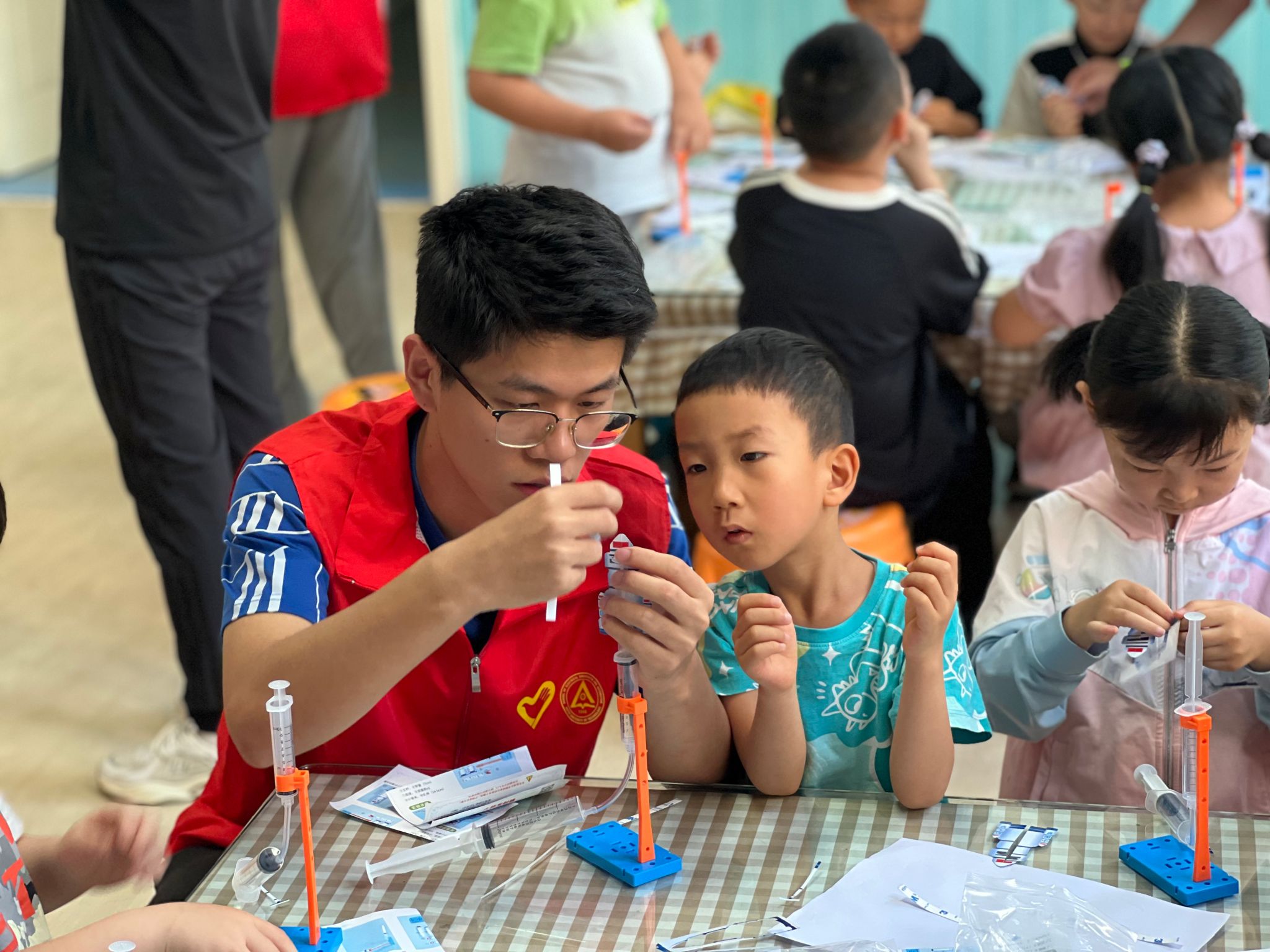 实践探索,学习“核”知识。宣讲团成员带领小朋友们动手实践,搭建运载火箭简易模型,为小朋友讲解运载火箭的结构和搭建步骤,带领同学们动手组装模型,在团队成员的帮助下,小朋友们顺利完成模型组装,并进行了“火箭发射实验”。小朋友们脸上绽放出快乐的笑容,本次活动激发了他们对科学实验的兴趣,在心中埋下了一颗科技报国的种子。宣讲团成员赵静怡在感悟中谈到,“在准备宣讲的一次次‘深挖’中,我仿佛回到了那个年代,切身感受到“两弹一星”科学家们舍小家为大家,勇担重任、不怕牺牲的伟大精神,正是无数前辈的无私奉献和艰苦奋斗,才有了今天的繁荣与安宁。我们身处国泰民安的好时代,更要坚定科技报国、工业强国的理想信念,将专业所学奉献国家所需,继续中国人的追光之旅”。