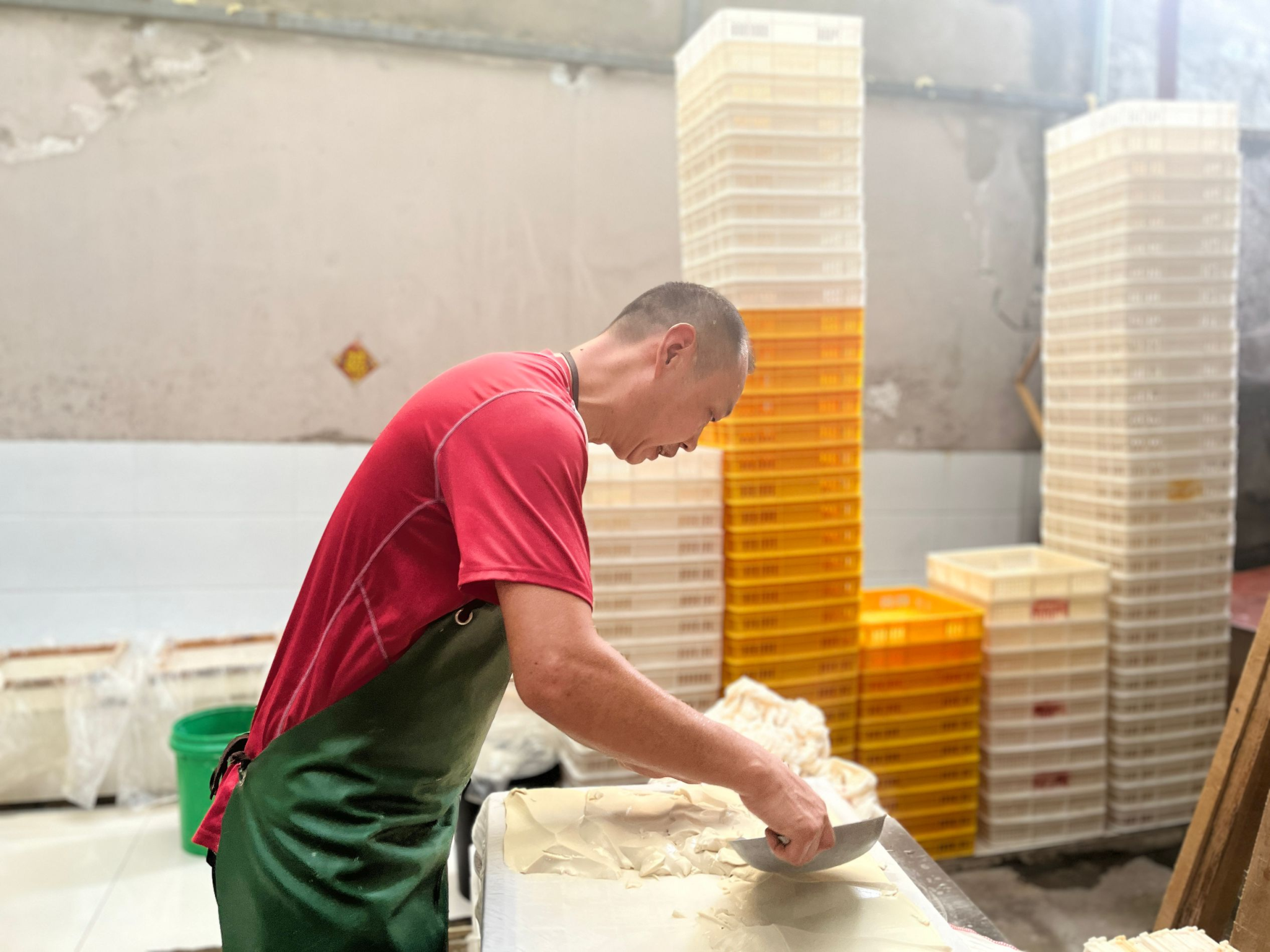 为了解传统豆腐制作工艺,团队赴往淮南寿县大泉村“老杨家豆腐坊”进行调研。传统豆腐制作工艺传承人杨兵向成员们展示了豆腐制作的整个流程。每一道工序都展现出了杨兵对技艺的认真态度与细致入微的匠心精神,每一个细节都透露出他对工作的热爱与执着。据了解,杨兵每天早上四点钟就要开始磨豆子、煮豆浆,一天的豆腐产量可多达2000公斤。当被问到为什么不选择更高效的机械制作时,杨兵自豪地说:“我们传统工艺精心制作出来的豆腐,清爽滑利,韧而不腻,其独特的风味是机械制作永远替代不了的。”
