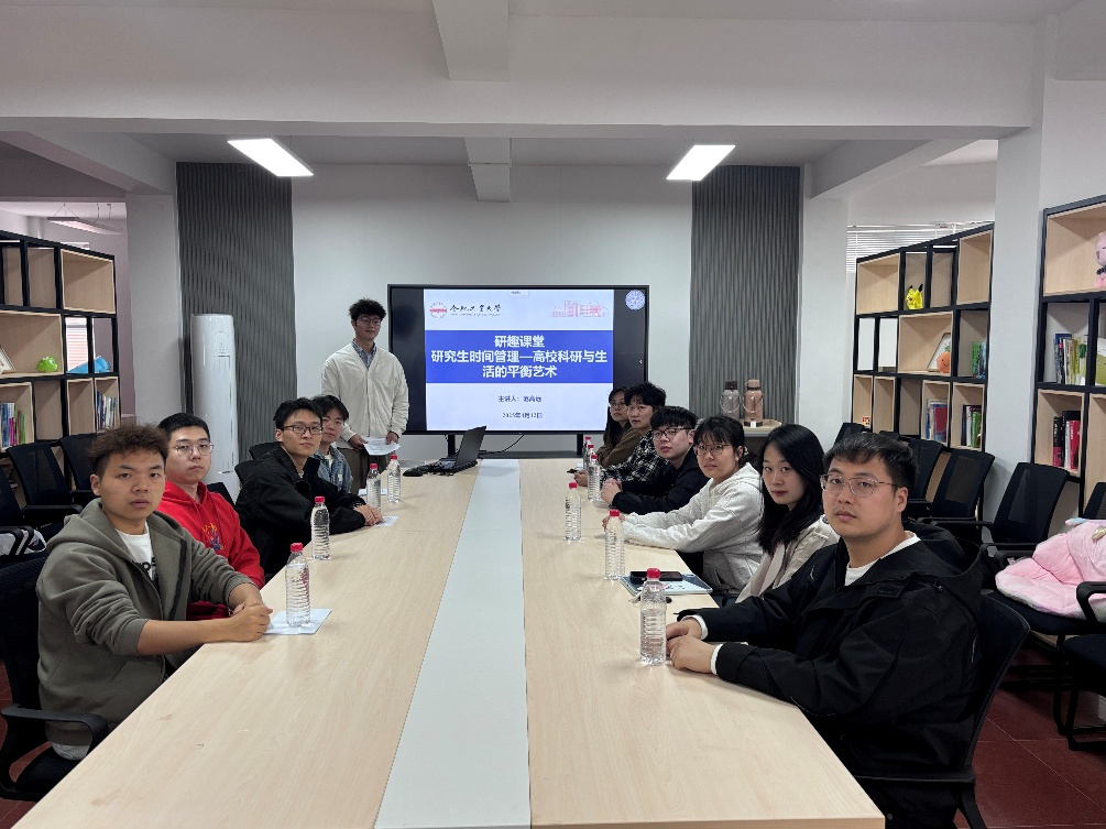 在屯溪路校区研究生新禧社区开展“研趣课堂”圆桌分享会活动,此次活动以“研究生时间管理——高校科研与生活的平衡艺术”为主题,学院范高远同学应邀做交流分享,15名研究生参与本次活动。