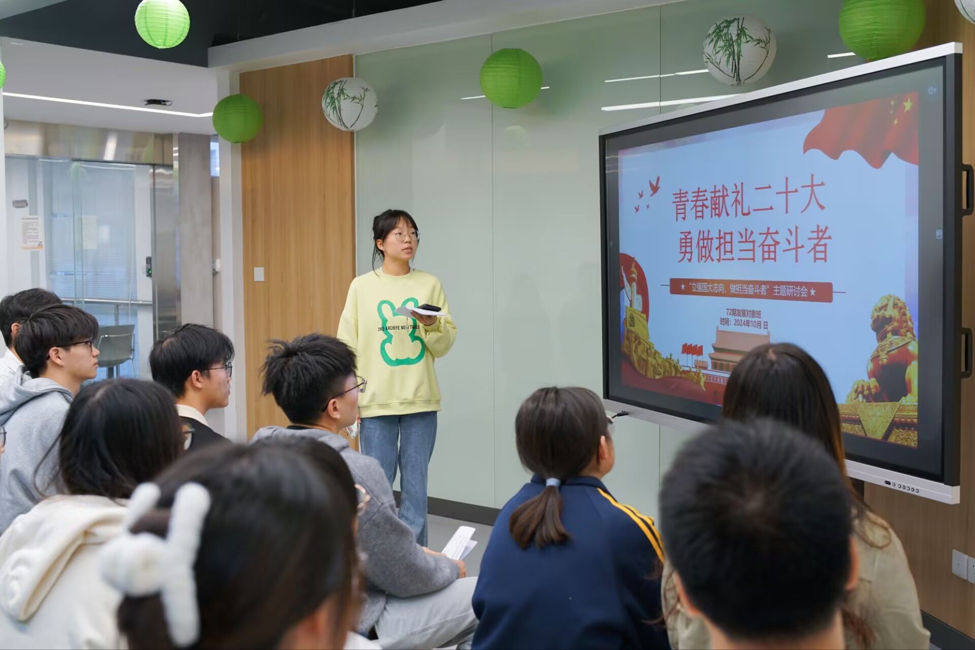 在逸夫楼1004会议室和五号楼社区沙龙活动室开展“立报国强国大志向、做挺膺担当奋斗者”主题教育活动,党校第72期发展对象班全体学员参与活动。
