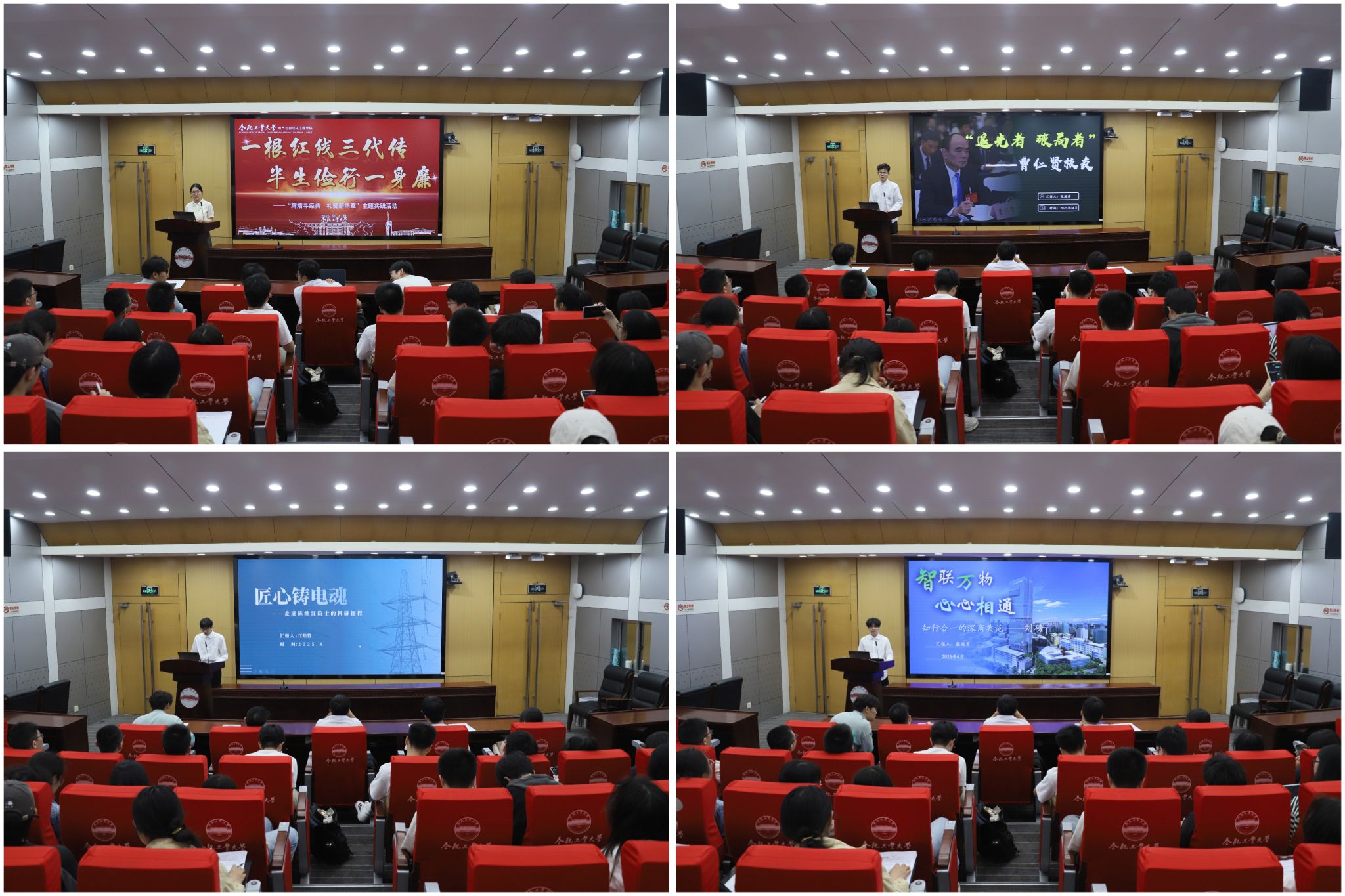 各组学员围绕李宏塔、陈维江、曹仁贤、刘磅等9位知名校友展开,通过介绍他们的求学、成长、就业、创业经历,挖掘他们以赤诚家国心回馈社会、以砥砺奋斗志破解难题、以工业报国志贡献力量的故事和精神,呼吁大家以校友为榜样,胸怀大局、把握大势、着眼大事,将自身发展与祖国未来紧密结合,为社会事业发展贡献力量,为科技强国建设添砖加瓦。比赛中,各组学员以饱含深情的语言、真挚动人的叙述勾勒校友的奋斗图谱,用青年语言诠释了榜样力量的初心,在历史纵深与现实回响中展现了工大电气学子对传承的思考。最终,《一根红线三代传,半生俭行一身廉》、《追光者,破局者》荣获一等奖,《匠心铸电魂》等3个作品获得二等奖,《深耕不辍——三十三年磨一剑》等4个作品获得三等奖。