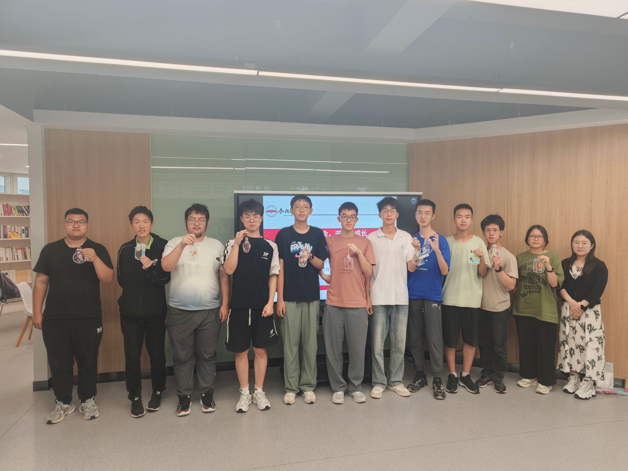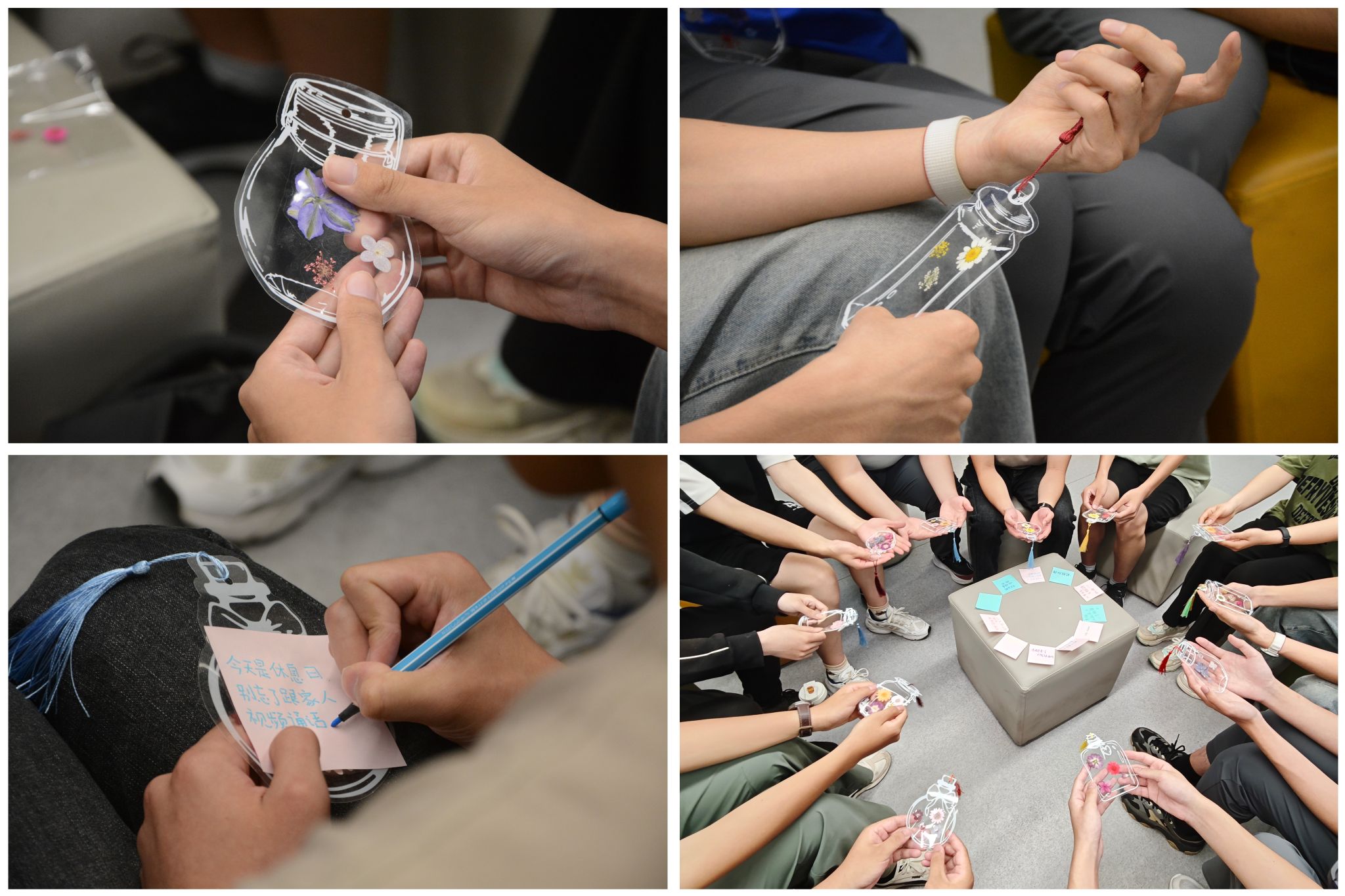 本次活动主要包含沉浸式领读、幸福圆桌派、手作书签和幸福结语四部分。活动开场,领读人选取《恰到好处的幸福》《追风筝的人》《蛤蟆先生去看心理医生》《云边有个小卖部》片段,带领同学们沉浸式读书,结合生活实例,生动解读幸福这一主题,引发大家对心灵成长与幸福真谛的思考。然后通过心理版的“谁是卧底”游戏快速破冰,引出“幸福”“喜欢”等相近词语。随后的手作书签环节,主讲人为参与者提供了干花、塑封膜等材料。大家用干花装扮出别样的书签,再配以灵动的流苏装饰,一贴一配中,将对幸福的理解与向往凝聚在小巧精致的书签上,赋予其美好的无声期许。活动尾声的幸福结语中,同学们纷纷执笔,在便签纸上写下一句句真挚感悟:有人写下“前程似锦”,有人感慨“幸福永远在下一个转角”。