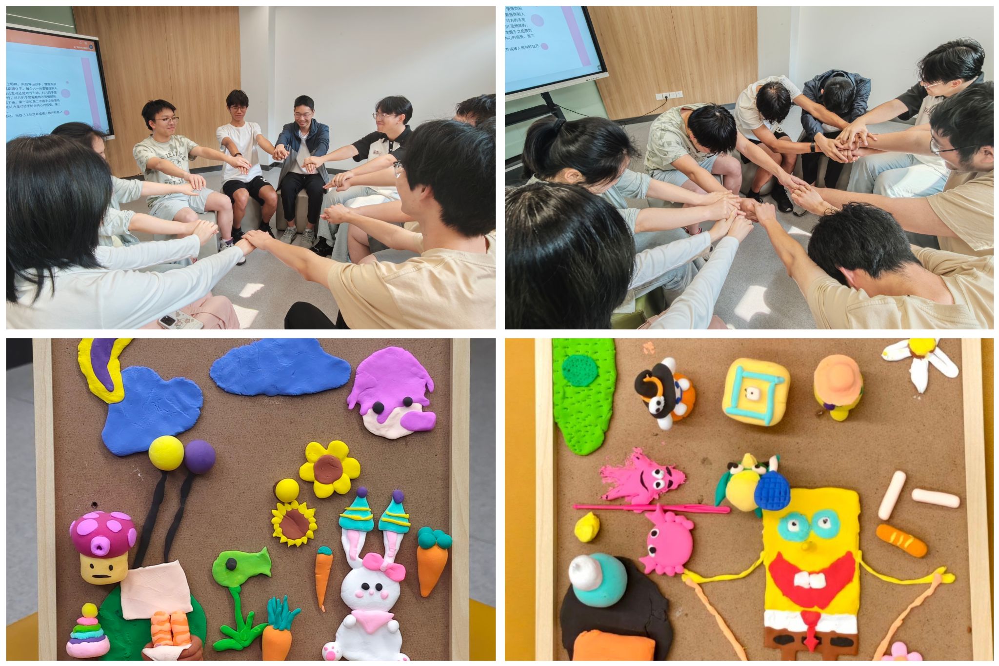 活动以“提升学生人际交往能力,构建和谐校园氛围”为目标,通过“非言语传递”“双向选择”“共创协作”三个环节,引导学生在实践体验中感沟通智慧。“投递空气球”,通过眼神与肢体动作,将“空气球”依次传递给所有组员,打破学生对言语沟通的依赖,发掘非言语沟通的社交价值。“双向选择”,学生根据指令主动与他人握手、放手,循环三次体验人际关系的建立与调整。“共创粘土画”,在团体协作中,成员共同完成一幅粘土画,以具象化形式展现沟通成果。