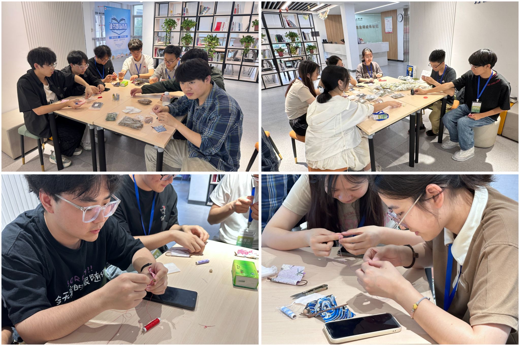 随后,全体成员开始精心挑选布匹,开始专注地穿针引线、填充香料、缝合收口。大家相互帮助、耐心细致、乐在其中,制作了一个又一个造型别致、香气馥郁的端午香囊。现场气氛温馨,交流热烈,成为节日里一抹“文明校园”的靓丽风景。