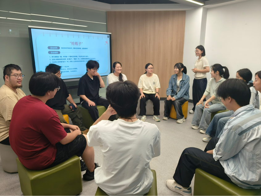 活动以“抢瓶子”与“你画我猜”两个热身游戏拉开序幕。“摸头发—摸膝盖—抢瓶子”随着主持人指令落下,成员迅速响应,在肢体协调与反应速度的较量中迸发阵阵欢笑;“你画我猜”环节里,队员通过肢体语言与简笔绘画传递抽象概念,“心理健康”“朋辈支持”等关键词在默契配合中被精准破译。活动现场氛围迅速升温。