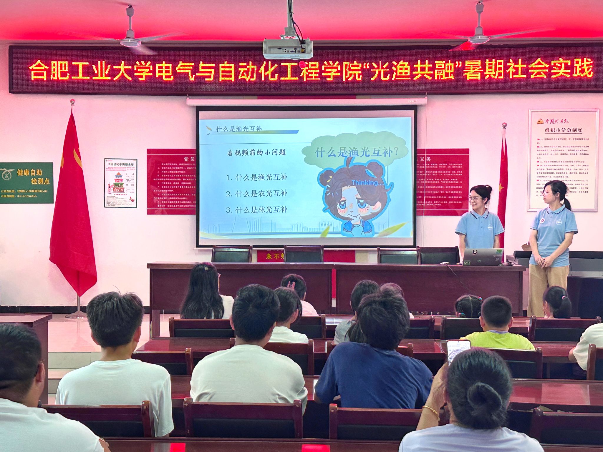 科普润心,儿童视角探秘电力奇妙知识。团队赴铜陵市西联镇东湖村开展电力知识科普课堂,成员们通过图文并茂的多媒体演示,讲解“渔光互补”模式中的电力知识,制作太阳能小车,使抽象的“渔光互补”发电原理和“双碳”节能目标变得直观可感。西联探路,乡民视角解码渔光互补生态经。团队走访西联镇部分村庄,在与渔民的交流对话中,团队成员深入了解渔光互补项目发展带来的生态社会民生效益。电站深入,企业视角解码渔光创新致富路。在铜陵东湖一期渔光互补发电项目部,成员们参观光伏设施,深入探究升压站的全局控制模式,了解了项目建设中遇到的困难及应对方法。肥东续力,拓展乡村能源新认知。在响导乡晶科科技渔光互补项目部,团队成员参观调研了电站中控系统的高自动化管理模式,通过座谈了解到肥东县项目根据区域特点因地制宜地实现了分块式区域局部协调发电。
