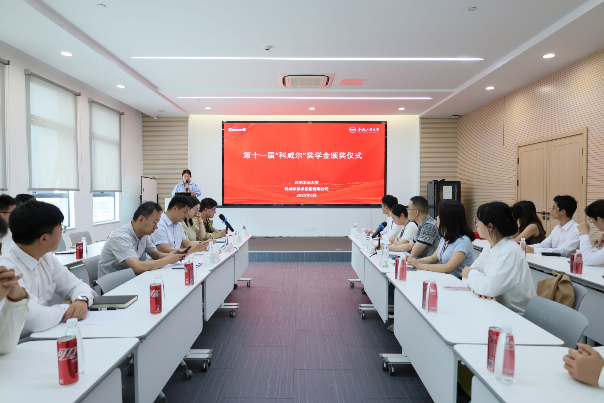 关于表彰2024年度“科威尔奖学金”获得者的决定》。2023级研究生刘博文代表获奖学生发言。与会领导老师为15名获奖学生颁奖并合影留念。