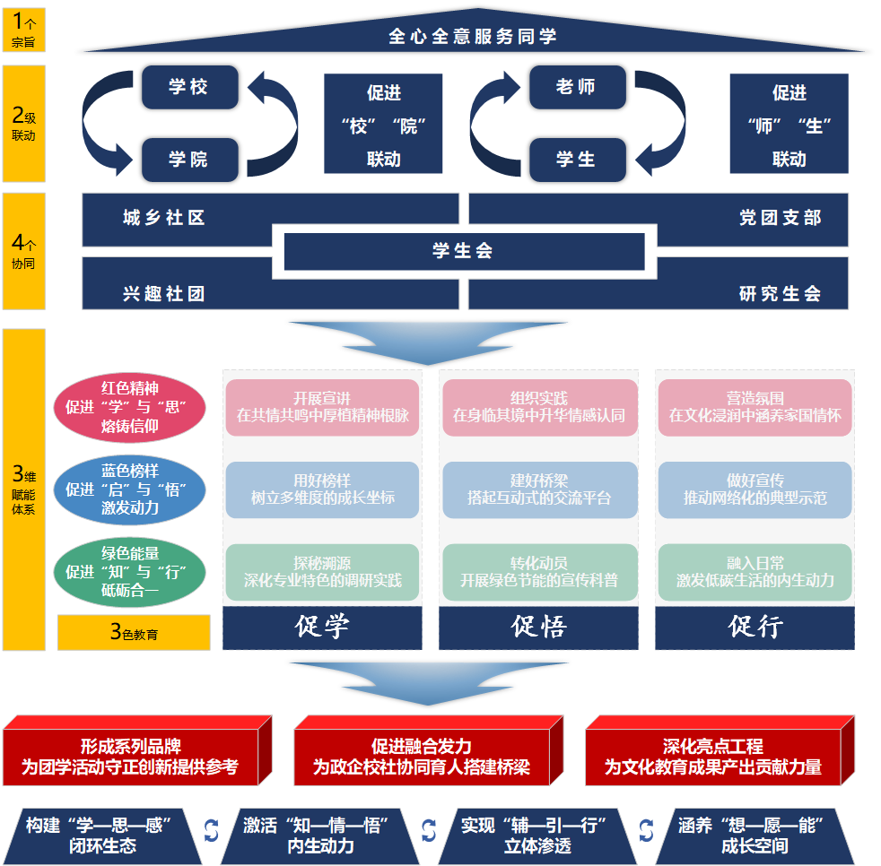 学生会(以下简称学生会)秉持“工业报国志、智慧新能源”的青春使命,聚焦学生成长需求,以“全心全意服务同学”为一个宗旨,促进“校院”“师生”两个层级联动,做好与城乡社区、党团支部、兴趣社团、研究生会的四个教育协同,围绕“红色精神—蓝色榜样—绿色节能”三色教育,结合三维赋能体系,创新构建了“12433”机制,以思想引领为魂、以榜样示范为引、以专业提质为基,建设“学—悟—行”联动的一体化范式。
