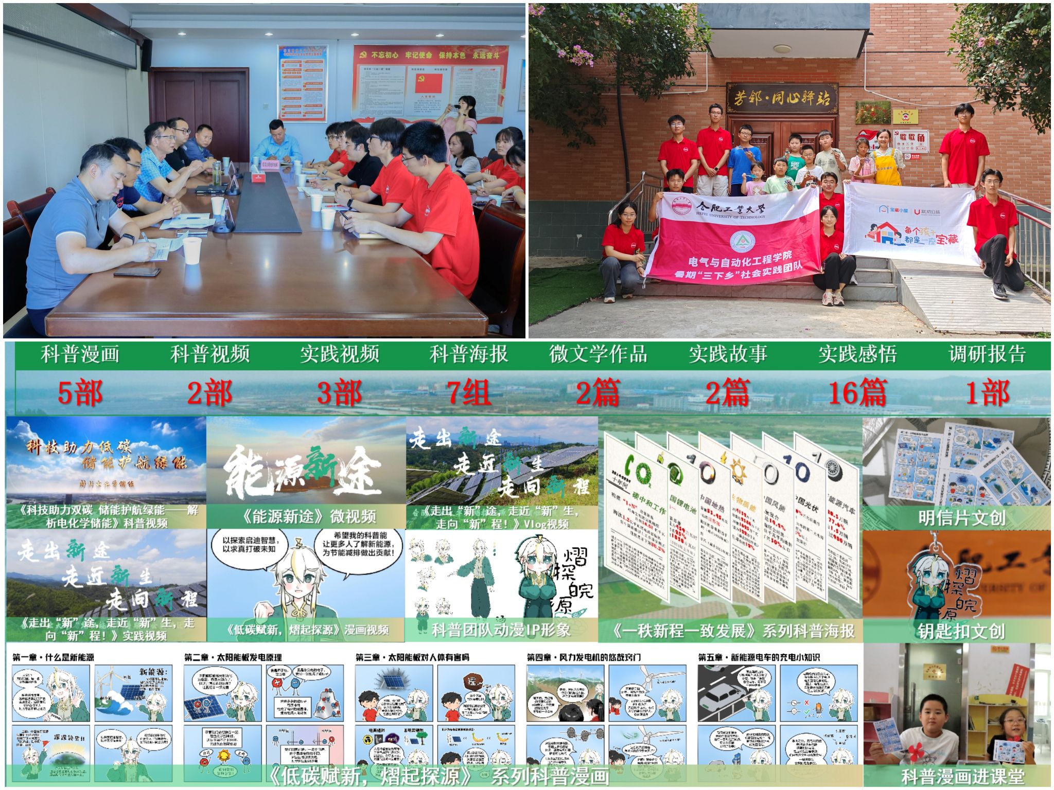 学生会成立绿色节能调研团,先后赴六安市金寨县、合肥市长丰县、瑶海区等地开展调研,产出原创IP形象、漫画、海报、视频、文学作品共计36件。成果进一步转化,并应用到新生迎新、入学教育、一站式学生社区楼层文化建设等教育工作中。