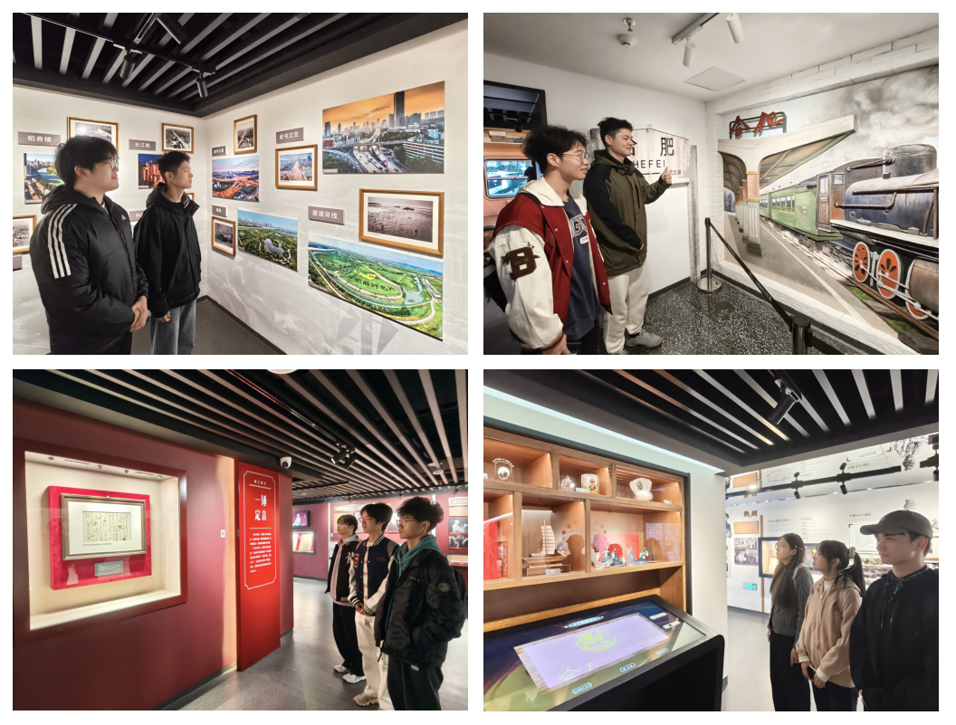 合肥城市记忆馆自2024年正式对外开放,聚焦1949年至2022年合肥市经济社会发展脉络,全方位呈现了合肥的成长轨迹。步入展馆,大家纷纷在城市图片展陈前驻足细看,并不时交流讨论:五六十年代,这里还是阡陌纵横的农田村落,充满着乡土气息;到了八九十年代,三孝口、四牌楼等区域展现出城市商贸的初步活力;而如今,政务区、滨湖新区高楼鳞次栉比,现代化都市风貌尽显。展厅内的复刻绿皮火车车厢成为展厅 “打卡热点”,同学们步入车厢,斑驳木质座椅、老式站台钟、手写车次牌与售票窗口铁栅栏映入眼帘,场景瞬间将人拉回上世纪80年代的合肥火车站,引发强烈时代共鸣。看到合肥交通建设的沧桑巨变,不少同学们表示渴望投身合肥城市建设,以实际行动为这座城市的更好发展贡献力量。