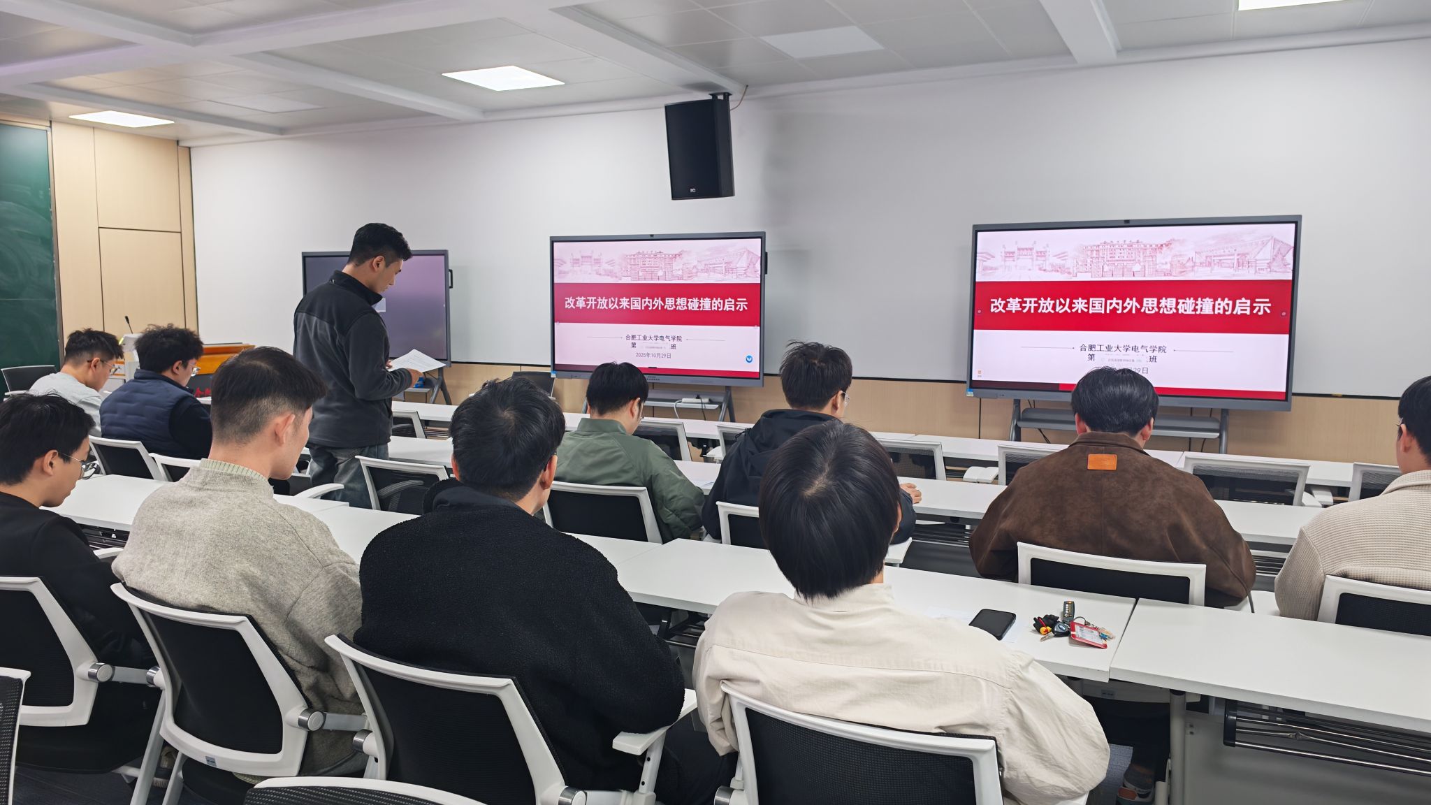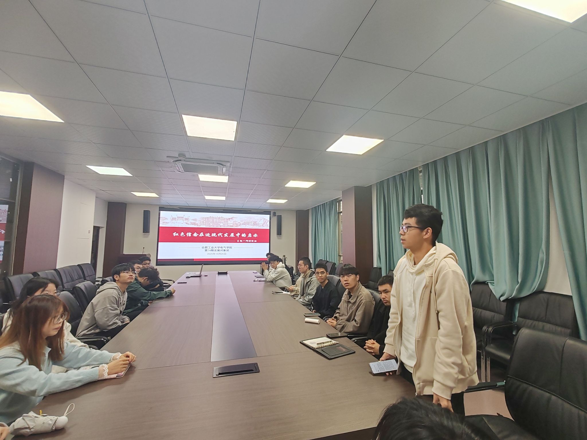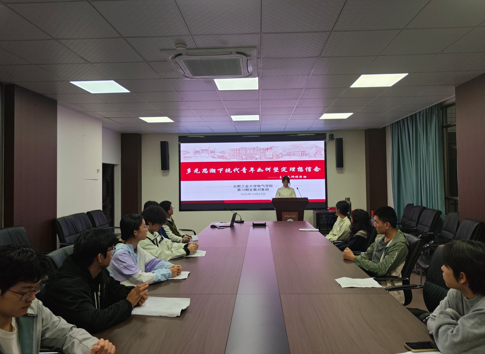 在逸夫楼会议室开展党校班系列交流研讨活动,第74期发展对象班全体学员参与活动。