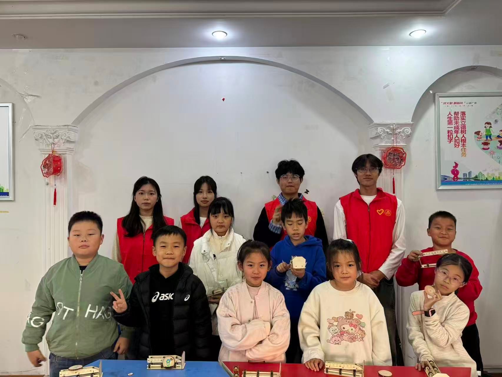 “巧手探理,童心筑梦”活动中,志愿者设置科学实验与创作实践环节,用简易材料演示磁悬浮列车磁极排斥原理,协助孩子们组装模型、感悟物理奇妙;DIY木片冰箱贴环节,志愿者孩子们鼓励个性化创作,让孩子们锻炼动手能力,体验创意变实物的成就感。