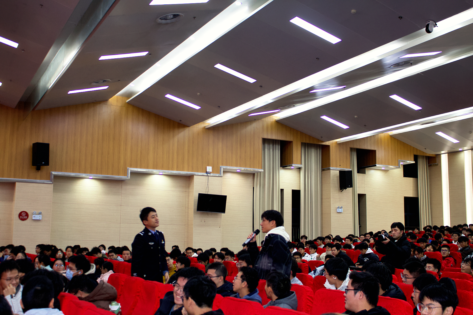 合肥市公安局刑侦支队五大队副队长、国家反诈中心安全学院防骗讲师杨础警官受邀主讲。他结合多年刑侦工作经验,系统深入讲解了电信诈骗的起源演变、作案手段的升级趋势、报警处置的黄金时间等内容,深度剖析了刷单返利、虚假购物、网络游戏虚假交易、冒充客服退款等高校高发诈骗类型,通过还原真实诈骗案例,直观展现电诈套路与隐蔽性。针对大学生群体社会经验不足、防范意识薄弱等特点,他强调“不转账、多核实、快报警”的防范准则,提醒同学们杜绝“贪小利”“存侥幸”心理,时刻筑牢个人财产安全“防火墙”。