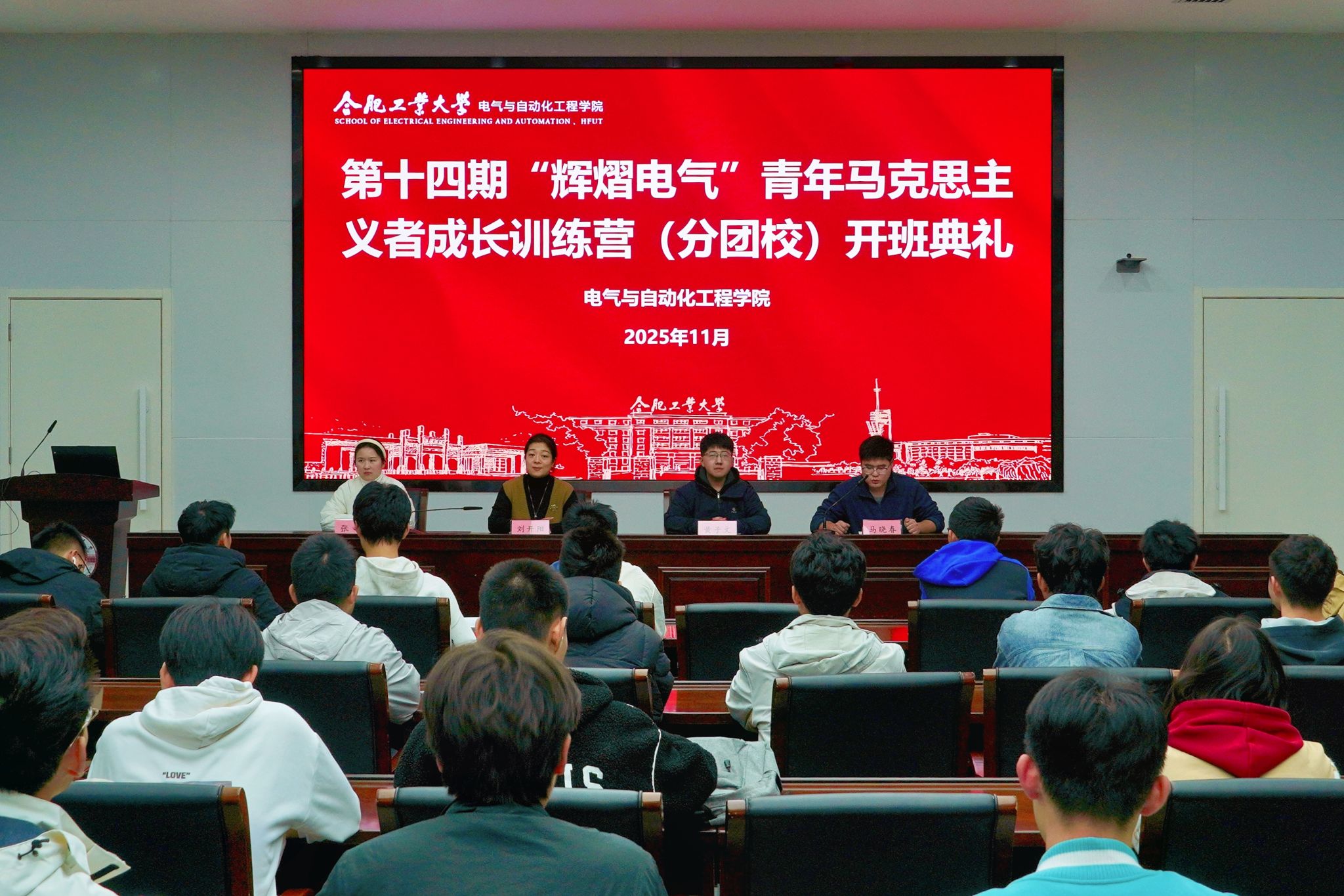 第十四期“辉熠电气”青年马克思主义者成长训练营(分团校)开班仪式在屯溪路校区学术会议中心三楼报告厅举行,学院团委、学工办相关教师、团校班主任与参训学员参加仪式。