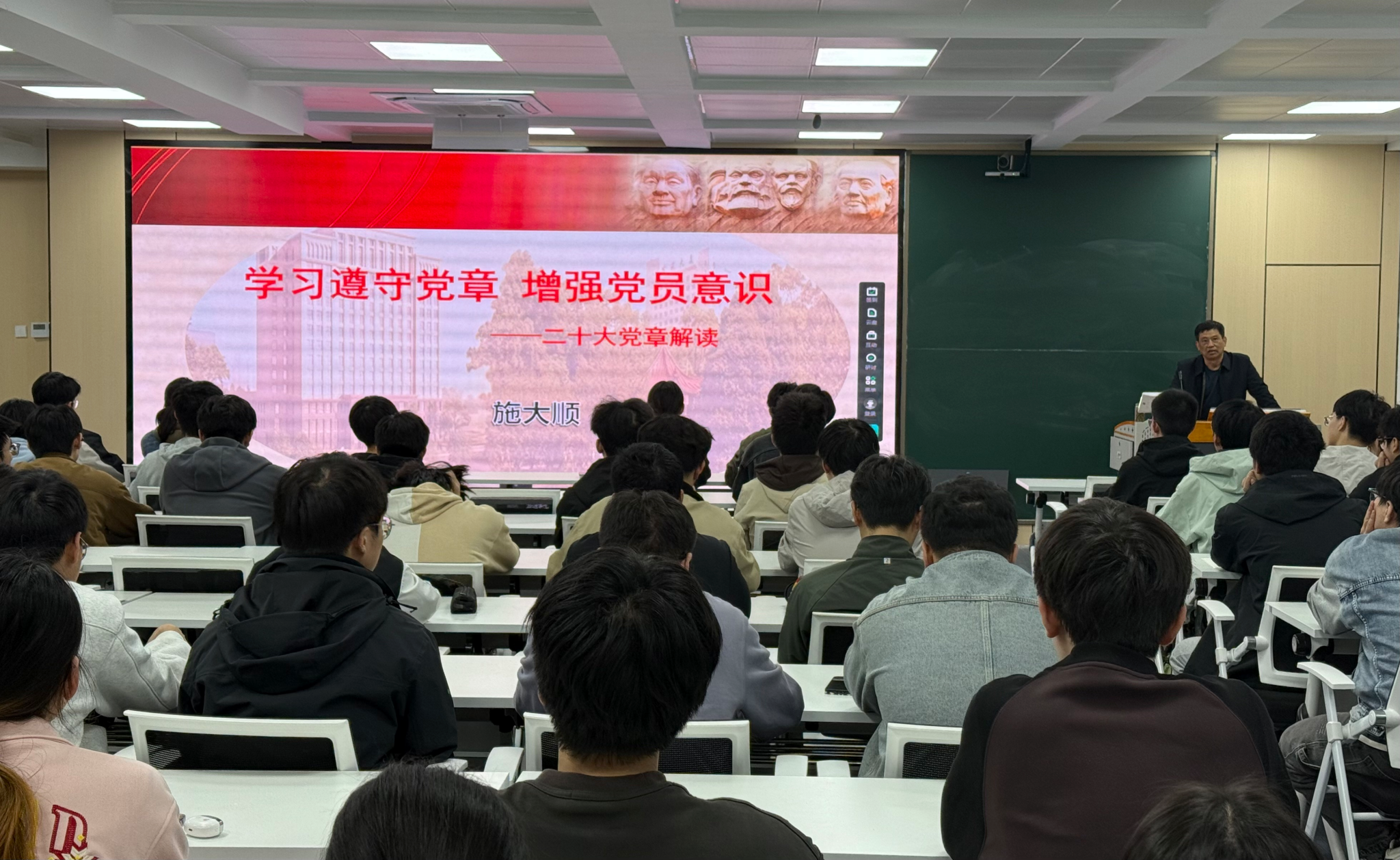 党课围绕二十大党章修改的必要性和原则、主要修改内容、严格遵守党章与增强党员意识三大内容展开。授课中,施大顺详细梳理党章从初步创立到稳步发展的百年演进历程,重点解读党章修正案中50 处修改要点,深入阐释党员身份意识、宗旨意识、责任担当意识的核心要义与实践路径。交流环节中,参会学员表示将切实做到学党章、守党章、践党章,以实际行动强化思想意识,为推动事业发展贡献青春力量。