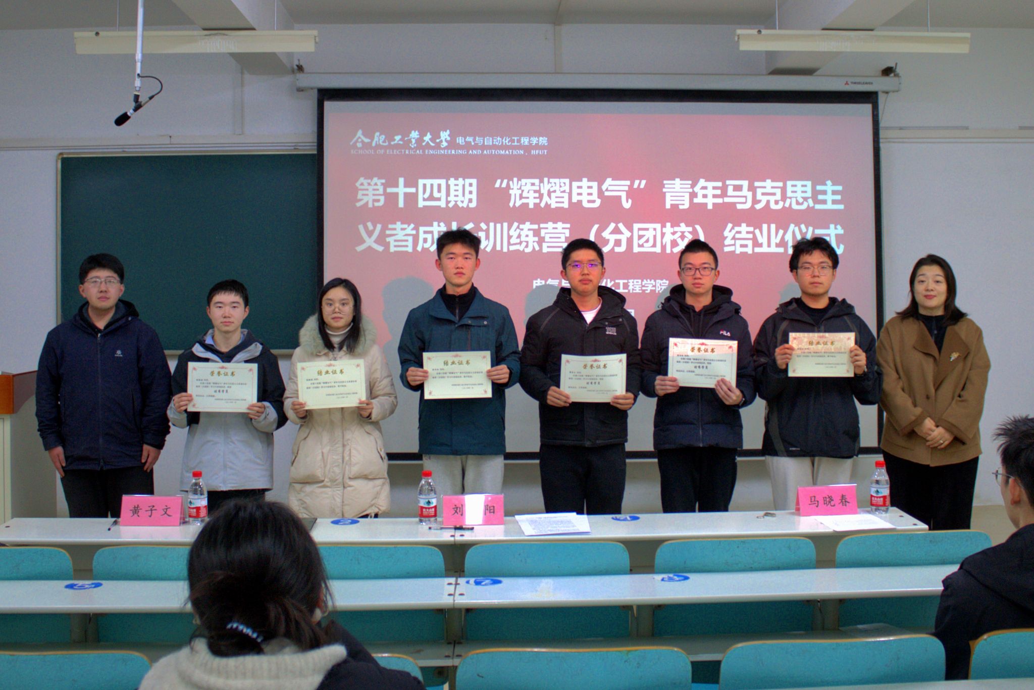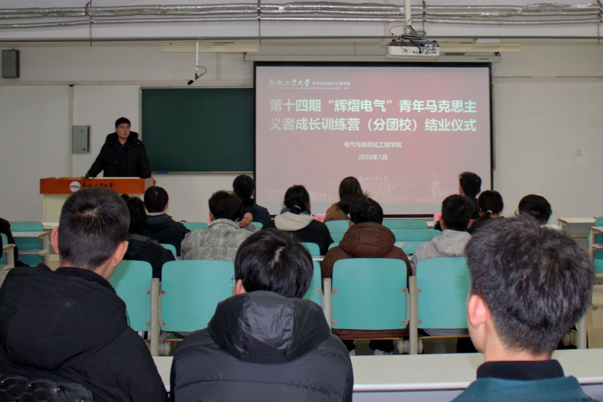 第十四期“辉熠电气”青年马克思主义者成长训练营(分团校)学员结业与优秀学员表彰的决定》。2025级电气工程及其自动化专业韩佳彤同学作为学员代表发言。本期训练营共计61名学员顺利结业,胡浩轩等12名同学获评“优秀学员”荣誉称号,与会领导老师为优秀学员颁奖并合影留念。