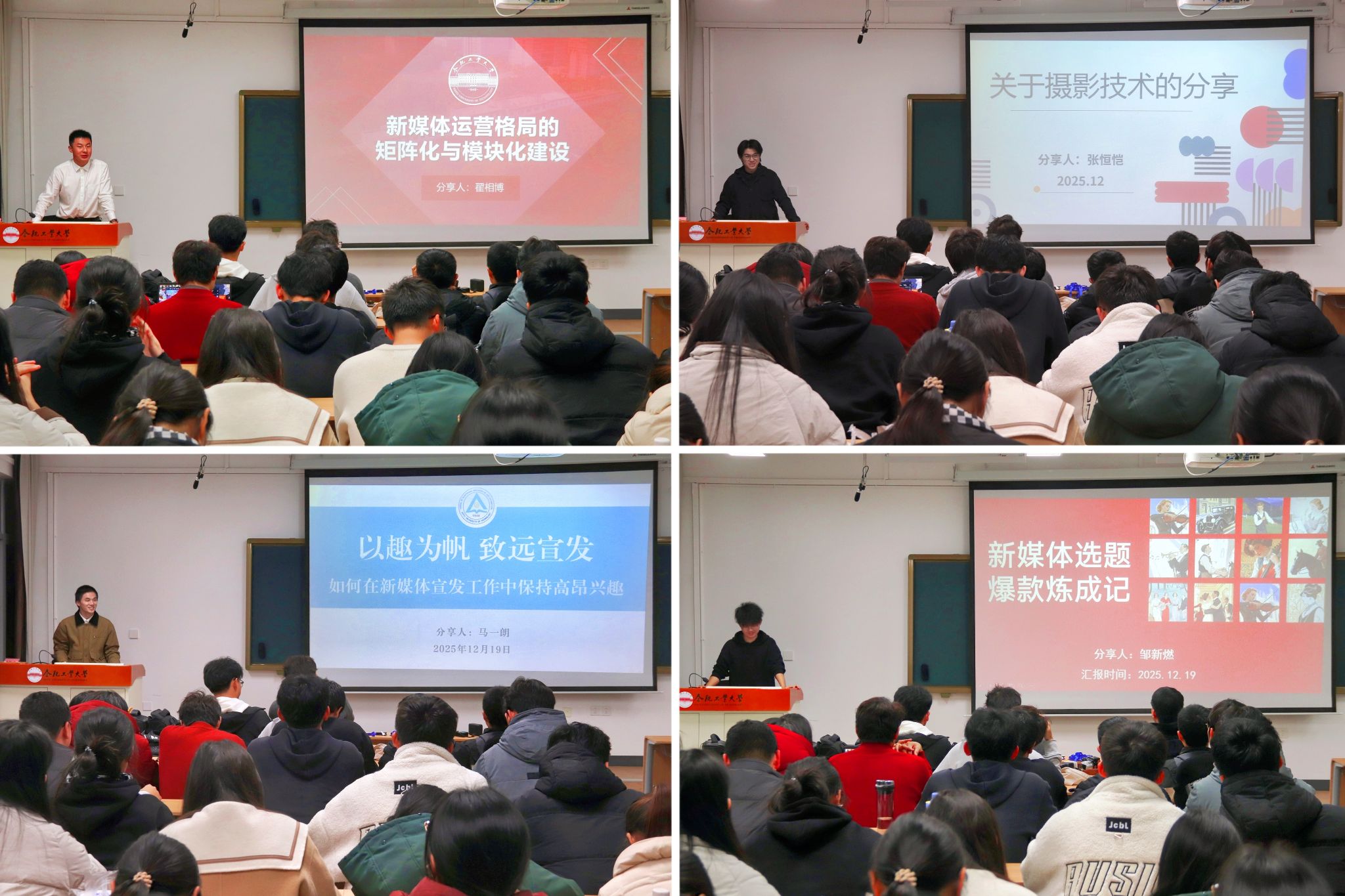 朋辈指引,领宣传队伍。校全媒体中心翟相博、校团委新媒体中心张恒恺、明理苑网络文化工作室马一朗、电气学院新媒体中心往届主任邹新燃四位同学分别以新媒体矩阵化打造、摄影知识基础、宣传兴趣培养、新闻选题与线索为题进行朋辈分享,基于校院两级新媒体组织联动,实现优质资源共享与工作思路交流。