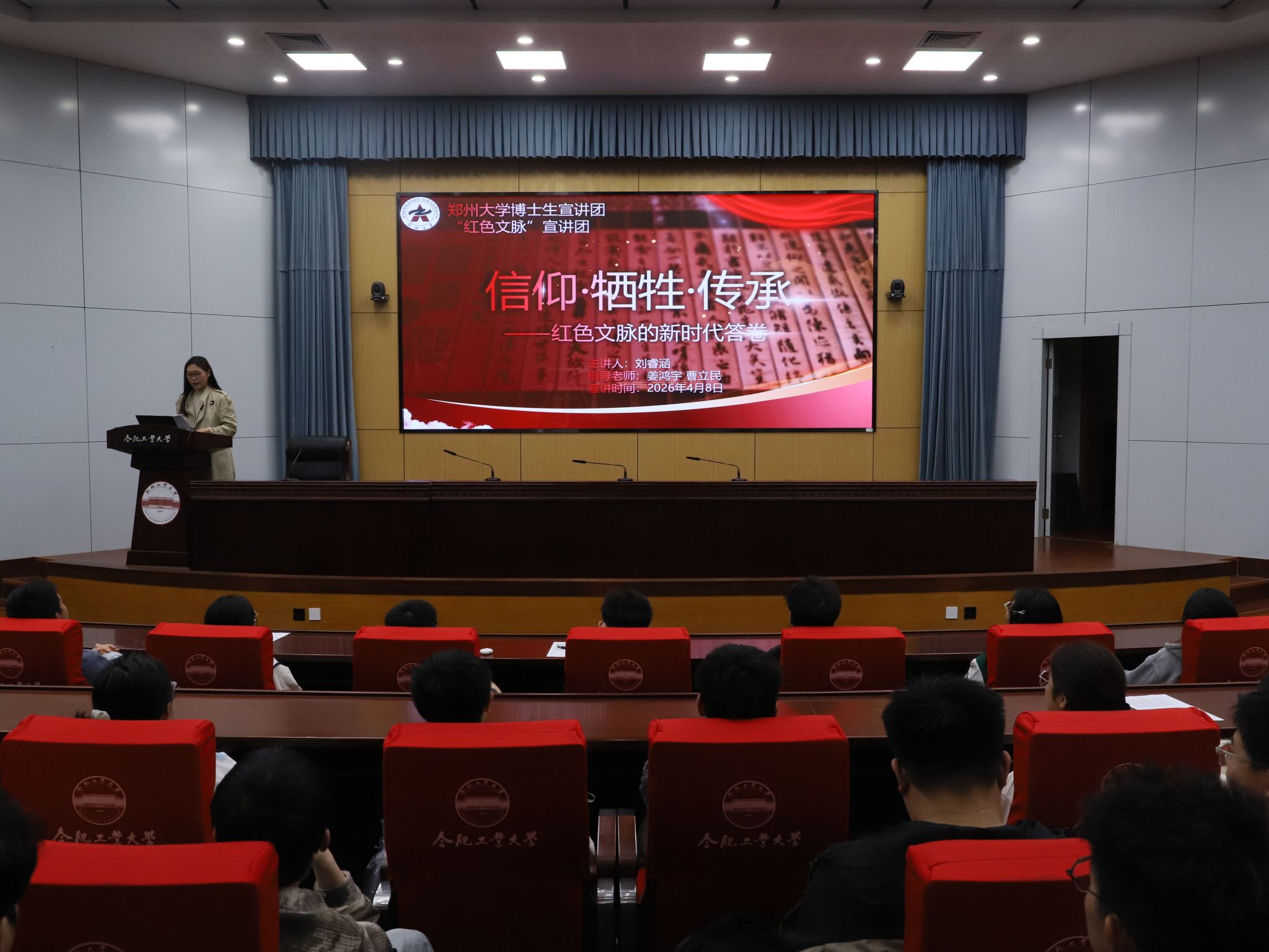 学院聘任郑州大学博士生宣讲团红色文脉宣讲团团长刘睿涵为“星熠铸魂”宣讲团朋辈导师,她围绕“信仰、牺牲与传承”的精神内核,带领现场师生重温红岩精神,深情讲述革命先烈的英雄事迹,引导同学们回望革命信仰之源,赓续红色血脉,以青春力量续写红色文脉新篇章。