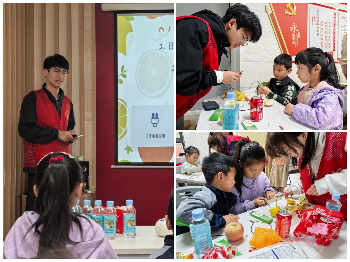 活动现场,阳光志愿服务中心志愿者提前备好柠檬、橙子、铜片、锌片、导线、发光二极管等实验材料,用通俗易懂的语言为小朋友们讲解电的基本原理与水果发电的相关科学知识。志愿者们避开枯燥的理论讲解,结合生活中的用电场景,用简单直白的话语解释水果中的电解质如何与金属片发生反应、产生电流并点亮灯泡,让抽象的电学知识变得生动易懂。在动手实验环节,志愿者们一对一耐心指导小朋友们分组操作,大家小心翼翼地将金属片插入水果、连接好导线,当小小的二极管成功亮起时,现场顿时响起阵阵欢呼。孩子们目不转睛地观察实验现象,积极提问、主动尝试,亲手感受化学能转化为电能的神奇过程,在动手实践中体会科学的魅力,点燃对科学探索的热情。